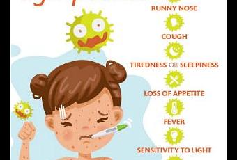 - Rash. It usually starts at the hairline and spreads to the neck, torso, limbs, feet, and hands.