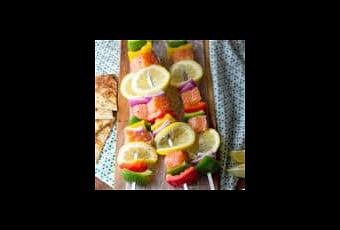 - Assemble the skewers with a mixture of salmon cubes, lemon slices, bell pepper, and onion pieces (as pictured). Season to taste with salt and pepper.
