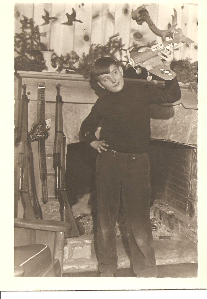Dick Williams, playing with one of his Christmas presents, a toy, WW ll, bomber plane. Dick was fascinated with speed and was the first kid in school, to have a motorcycle, when he was only 14 years old.