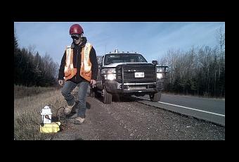 A worker with SWN Resources Canada contractor Geokinetics walks toward a geophone on the shoulder of Hwy 11 in New Brunswick. APTN/Photo