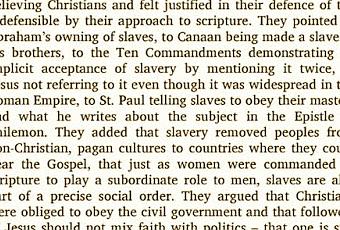 As Michael Coren reminds us in his Epiphany: A Christian's Change of Mind and Heart Over Same-Sex Marriage (Toronto: Signal, 2016), p. 61, not only did some Christians oppose slavery and work for aboltion, but many Christians also avidly defended slavery. Noting as they did so that slavery was practiced by the biblical patriarchs, blessed by the bible, taken for granted by Paul, and had long been considered essential to proper social order in Christian societies — just as the subordination of women to men was essential if Christian social order was to be maintained in Christian societies.