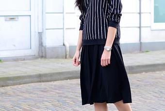 Most of you might know by now that every now and then, I like to step out of my comfort zone a little and try something different. Sometimes that works out really well (shiny pants are here to stay now and I never regretted these harems either), sometimes it just makes me realize that not everything can be translated into my own style (sorry, don’t think I’ll ever be wearing pink coats again). I don’t mind both outcomes though, it’s ok to make a fashion faux pas every once in a while. I think a personal style develops constantly and clothing that fit into your style are always added and removed when you change, collections change, the industry changes. Also: if you never try, you never know. I was convinced that midi skirts were not for me. At all. It’s probably the most feminine skirt out there and you know I have some femininity issues every now and then, I just prefer to look like a little boy most of the time. But last week I took on the challenge with myself and ordered a midi skirt. I was actually surprised by the many good varieties that are out there at the moment (like here). I decided to not take it too far though and ordered a simple black one. Once it came in, the next step was (as it is with anything feminine, heavy printed or ‘a little much’) how to dress it down. Which is my favorite thing to do, dressing down. Yesterday, it all came together. The sun was shining, I was in a sportswear mode and went bare legged (wasn’t even cold!) in black and white. I think the midi skirt is a mission accomplished, embraced into my wardrobe.