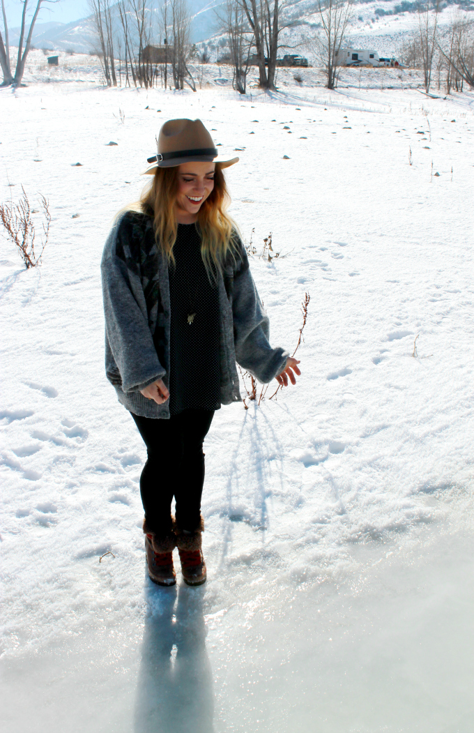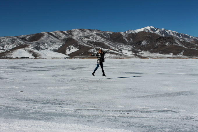 As you drive to Midway (from Provo Canyon) you pass Deer Creek. Little did we know that it had completely frozen over! So of course we had to stop and test it out. The shallowest part of the lake had thawed because of the warm temperatures, so it was a matter of crossing that without getting wet...