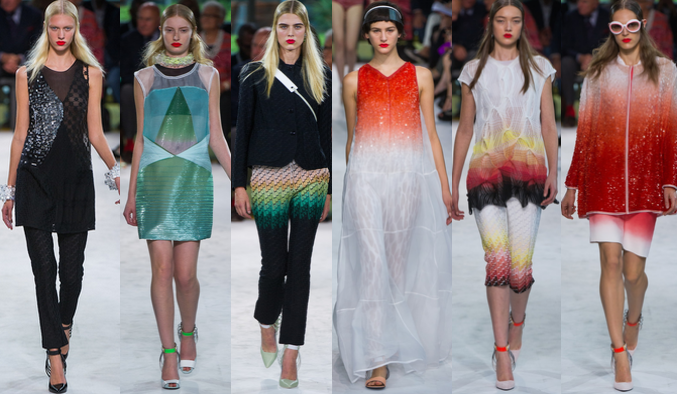 Texture played a huge part in the Spring 2013 collection by Missoni, with a few garments actually resembling some sort of ligament or muscle. I'm not just being strange: seriously, Google what a muscle looks like and then have a look at the white ombre design second from the right - not the pattern, but the way that the fabric has been manipulated. Similar, eh? What I loved the most from this collection, was the use of sequins to create texture, dimension and a play on the dye trend which has been shown at a few shows for SS'13. I think it's great how the designer used them to play with color and create an ombre effect from red fading in to white. The shoes in this collection were also stunning with the pop of color being shown at the ankle in a minimal way to keep the focus on what was happening up top. It might not be a collection that I would wear personally, but it was certainly lovely to look at and appreciate.