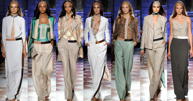 Finally, we have the Roberto Cavalli collection. Much like the Just Cavalli collection shown on Friday, there was a new air about the fashion house. It was fresh, crisp and clean and sported some amazing prints and all-white ensembles. After seeing quite a few designers show large portions of their collection all in white, I'm starting to feel a little inspired to see what I can come up with myself. The shredded trousers in white, black and nude were an interesting concept and had a more punky feel to them: mixed in with the clean whites and amazing prints and you had a winning combination. The collection was over-all elegant, sophisticated and contained just the right amount of edginess to keep the collection from being too grown up or boring.