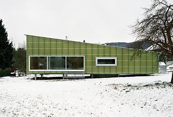 In a Swiss village on the Rhine River, a home built from concrete and compressed straw is perched above the ground on concrete pilings. The structure's design prevents it from damaging the ancient Roman artifacts buried in the surrounding soil, and enables it to be as green as its facade with regard to eco-friendliness.