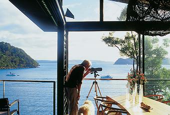 The James-Robertson house is composed of three separate structures perched in trees overlooking Australia's Pittwater Bay. With a bird's-eye view of its surroundings, smooth wood floors, and open decks that integrate common rooms with the outdoors, the home combines luxury with a natural experience. Photo by Richard Powers.