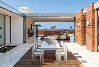 Laguna Beach is an upscale beach town south of Los Angeles in Orange County, and that’s not the only reason why I’m in love with this house. I love it because of what it does best- it brings the outside in. Not difficult to do in balmy Southern California I admit, but even the design is minimalist indoors and outdoors, as if not to distract from the blue skies and the shoreline. Limestone, glass and even a huge aquarium in the dining room make this an ultra chic dream home. Looking at these beautiful pics I can almost hear the ocean.