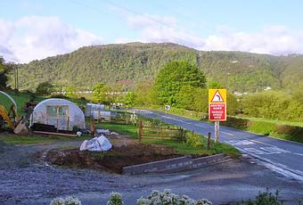 The little digger you see behind the stone mountain and to the left of the earth mountain is his tool of choice today as he merrily chips away at more of the hillside.
