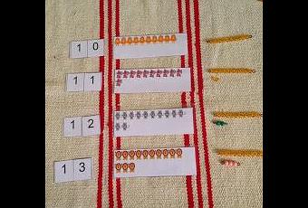 So,for this exercise, we count the animals. For example for number 12, match the number of animals with the beads (using a ten bead bar and a two bead bar) and we "write" the number. I have laminated the number cards, so we have cards with 10 written on them and Derin needs to find the number 2 and put it over the zero to make 12.