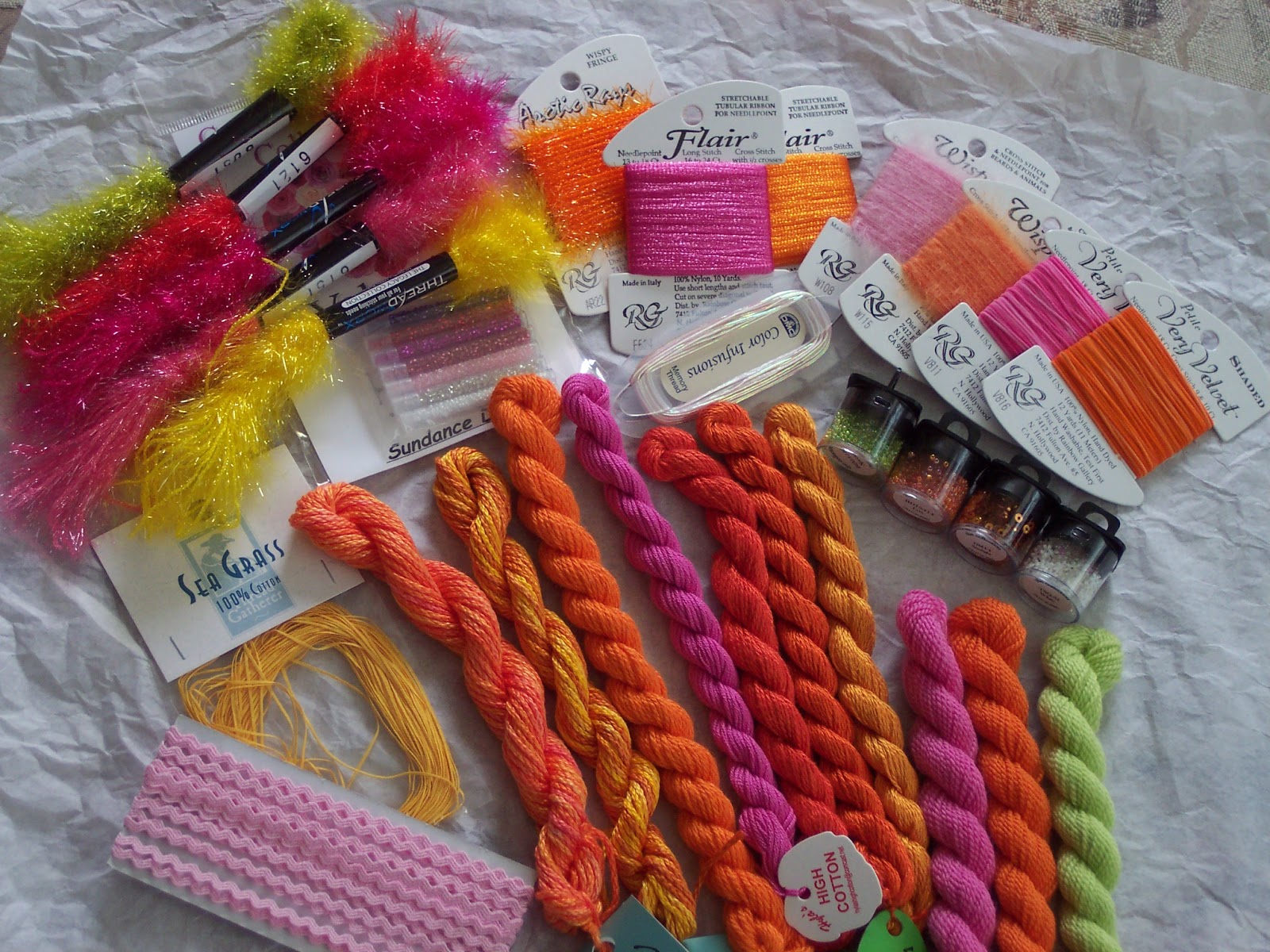 But first, lets go way back in time to when this series was just a set of unstitched canvases and a big pile of threads and embellishments. This is a picture of the initial batch of threads I assembled when I started out. A few were removed, but many more were added to take their place!