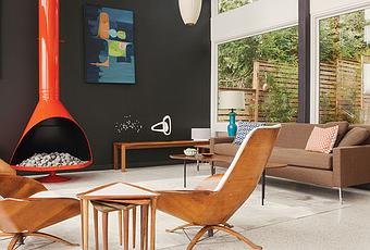 Two Seattle homeowners remade a soggy midcentury home as a thoroughly modern masterpiece by punching up vintage numbers with bold color. A pair of vintage George Mulhauser for Plycraft chairs is complemented by a powder-coated orange fireplace, a coffee table by Alexander Girard for Knoll, and a pair of undated paintings by Arthur L. Kaye. Photo by Kyle Johnson.