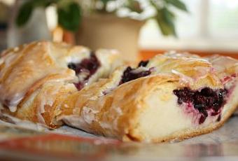 Spread cream cheese mixture down the middle of the the dough, add fruit on top of cream cheese mixture. Now you will have a bit more than an inch of dough left on each of the sides. Slice the dough in a diagonal lines, and fold these over on top of your cream cheese mixture so it has a braided look to it.