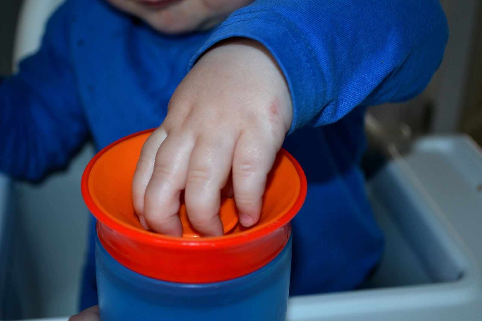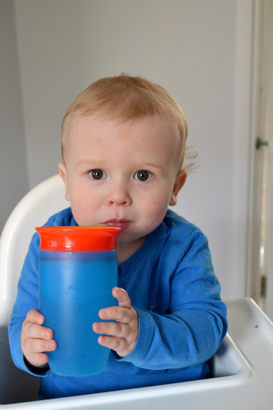 We've found the perfect solution - the Munchkin Miracle 360 Sippy Cup. I love the bright blue and orange color and the narrow design which is ideal for little hands to get a good grasp on.