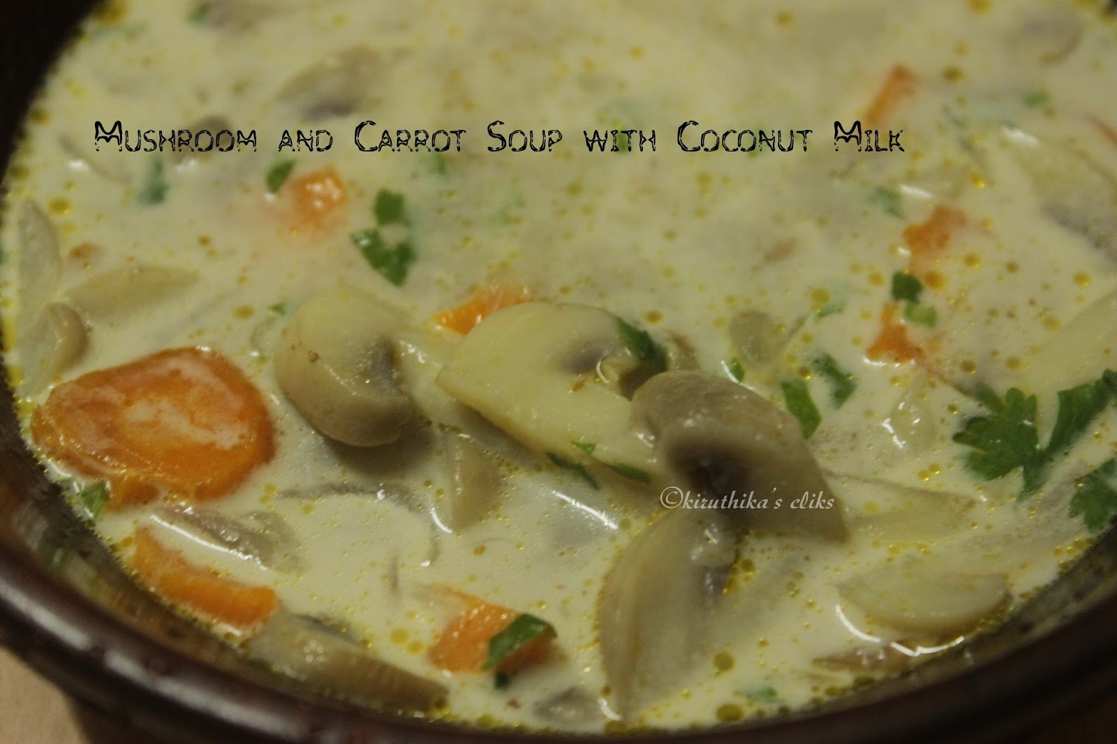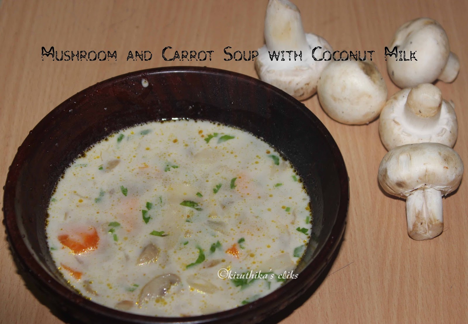 Mushrooms have good source of vitamin B, lots of minerals in them like potassium, phosphorous, selenium and so on. Added they are vegan too. Coconuts are rich in fibre, vitamin C, E, B1, B3 ,B5 and B6, minerals like sodium, calcium and so on. Coconut Milk is the best substitute for milk for people with lactose intolerance and vegan diet.Prep time 10 minsCooking time 15 minsIngredients 1 cup Mushroom (Cleaned and Chopped)1 tbsp Onion finely chopped1/4 cup Carrot (Cleaned and Chopped)1 tbsp Cilantro (or Coriander Leaves)1 cup Water ( For cooking mushroom and carrot)2 cups Coconut Milk1 tbsp GheeAs per taste Pepper powderAs per taste Salt