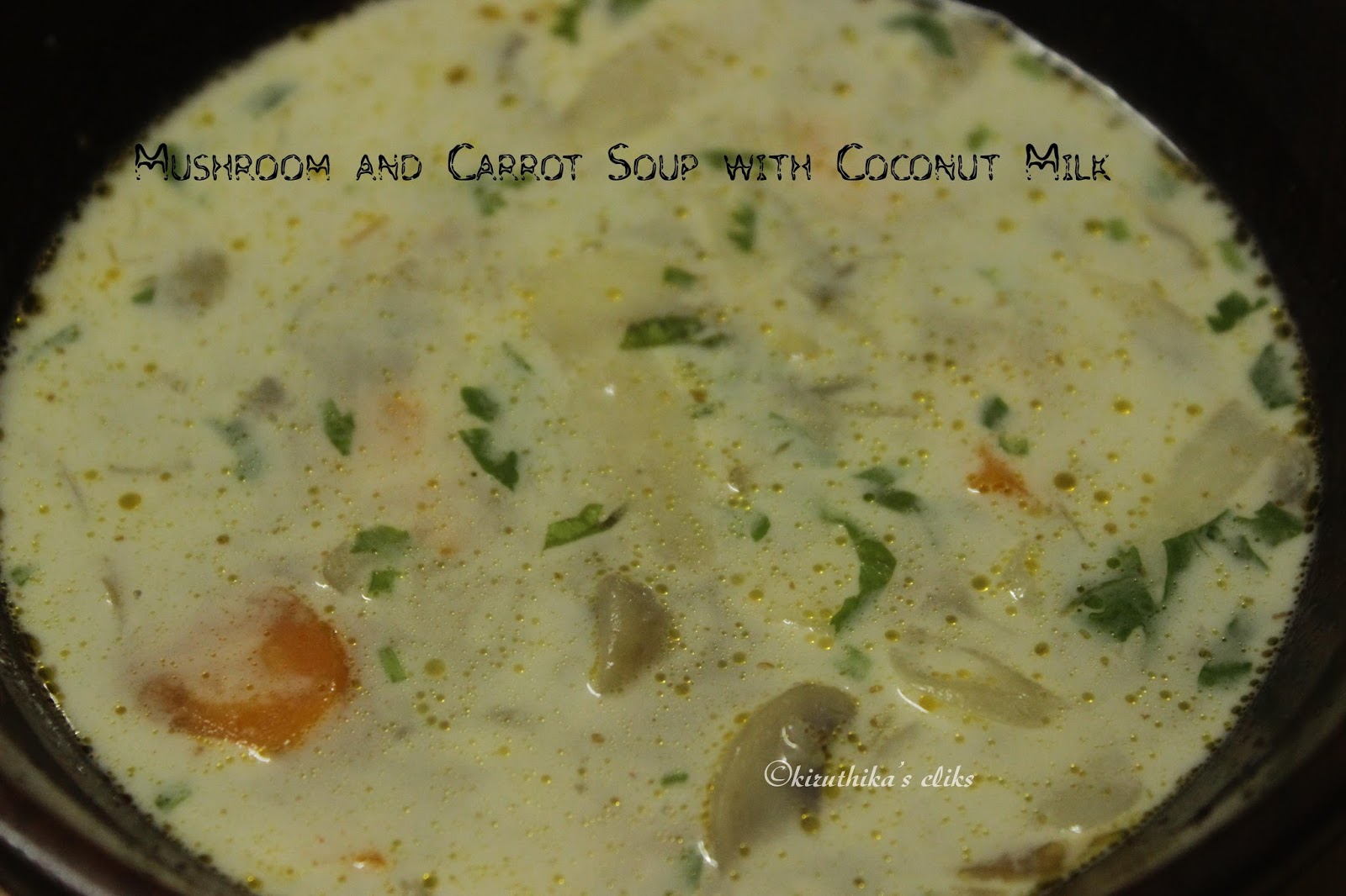 Now a days I am trying to make my daughter to eat on her own, The reason behind my ingredients for the soup: Carrots and Mushrooms. My total family are clear soup lovers. So wanted to give a special flavor to the soup apart from normal ones and decided to add this outstanding coconut milk. A complete and absolute Vegan Soup..