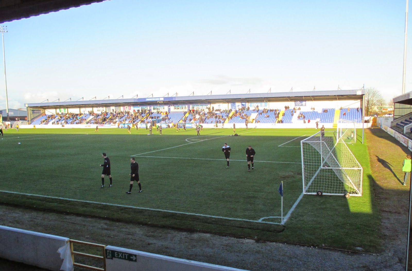 The stadium has a capacity of 5,300, the only change made since its construction being the conversation of the south away terrace to seats, which cut the capacity from the initial 6,012. There is still terracing behind the north goal, renamed in December 2006 after former manager Harry McNally. The main stand is on the east side which has a single tier of blue seats split into eight blocks, similar to the west stand, of which both stands have a capacity of approximately 2,100. There are narrow floodlight masts in each corner which makes the ground a bit easier to spot amongst the busy industrial area and retail shopping park.