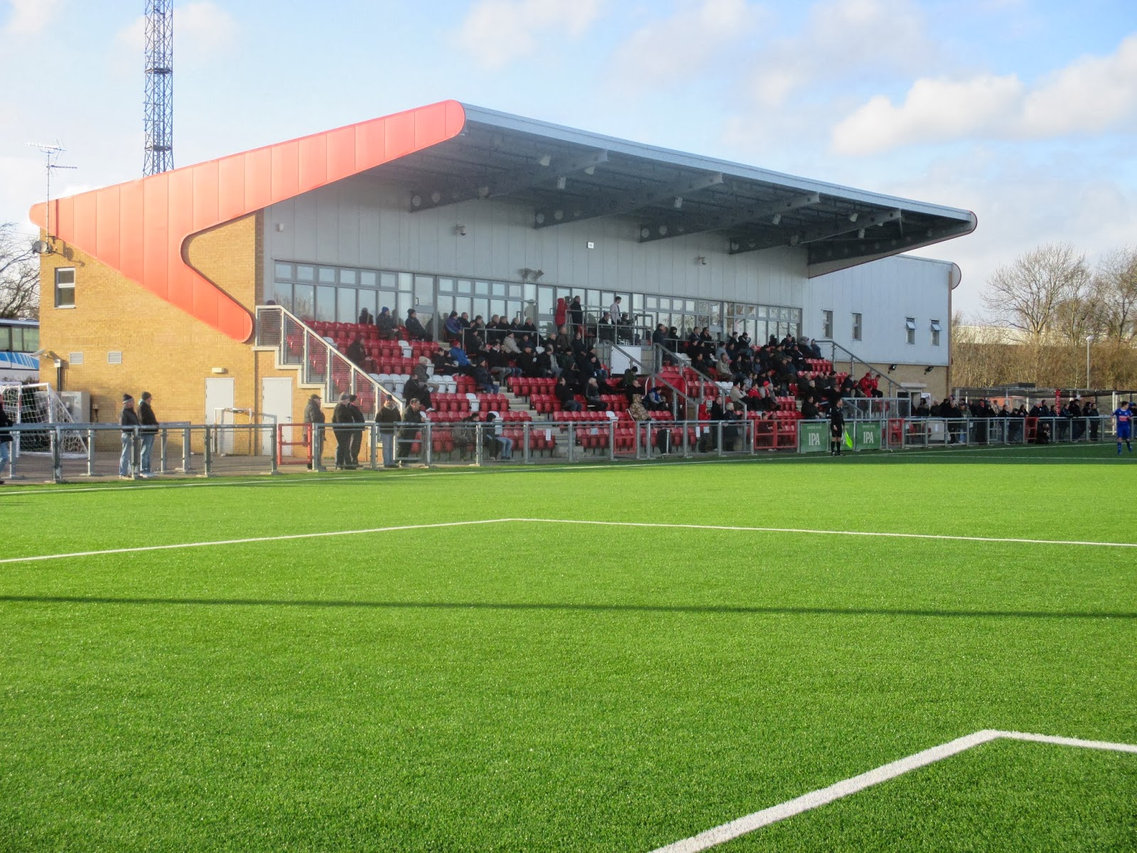 The Groundhoppers public enemy number 1 is the British climate, which is in the hands of our nemesis - the Weather God. You always running the risk of pre-booked plans going tits up after a few days of heavy rainfall, this being the case today as Gateshead's Conference away fixture at Welling United fell foul to a waterlogged pitch. Thankfully the match was called off on Friday morning, which gave me enough time to workout alternative arrangements. I had planned to meet up with Tom Salinger (Squad#96) at Wingate & Finchley, where I was to be giving the privilege of presenting the man of the match award, but this too was postponed. However I was confident that my Plan C was definitely a goer as Harlow Town have a new 3G pitch. The Weather God may be our foe but we have a friend in the third generation playing surface.