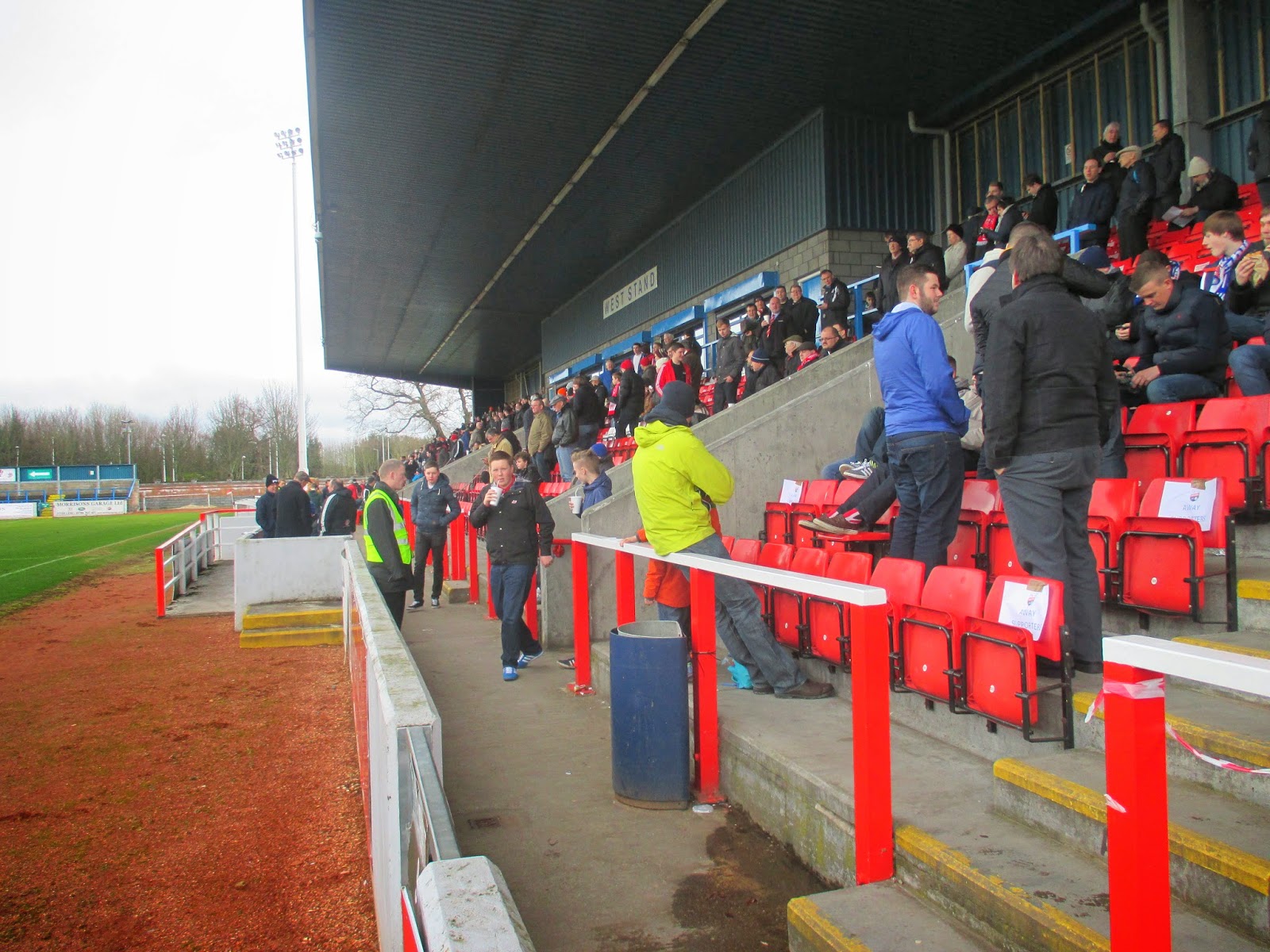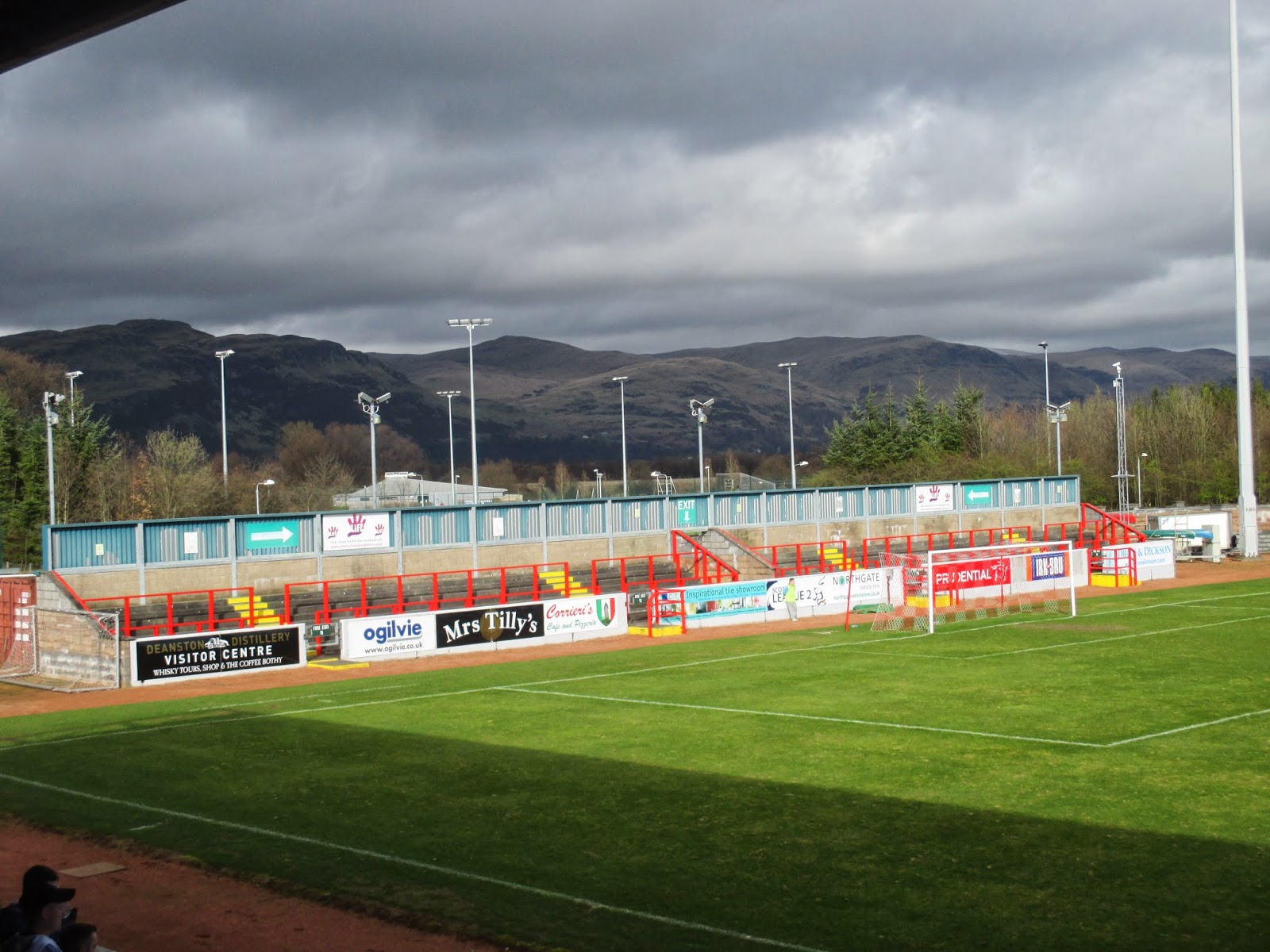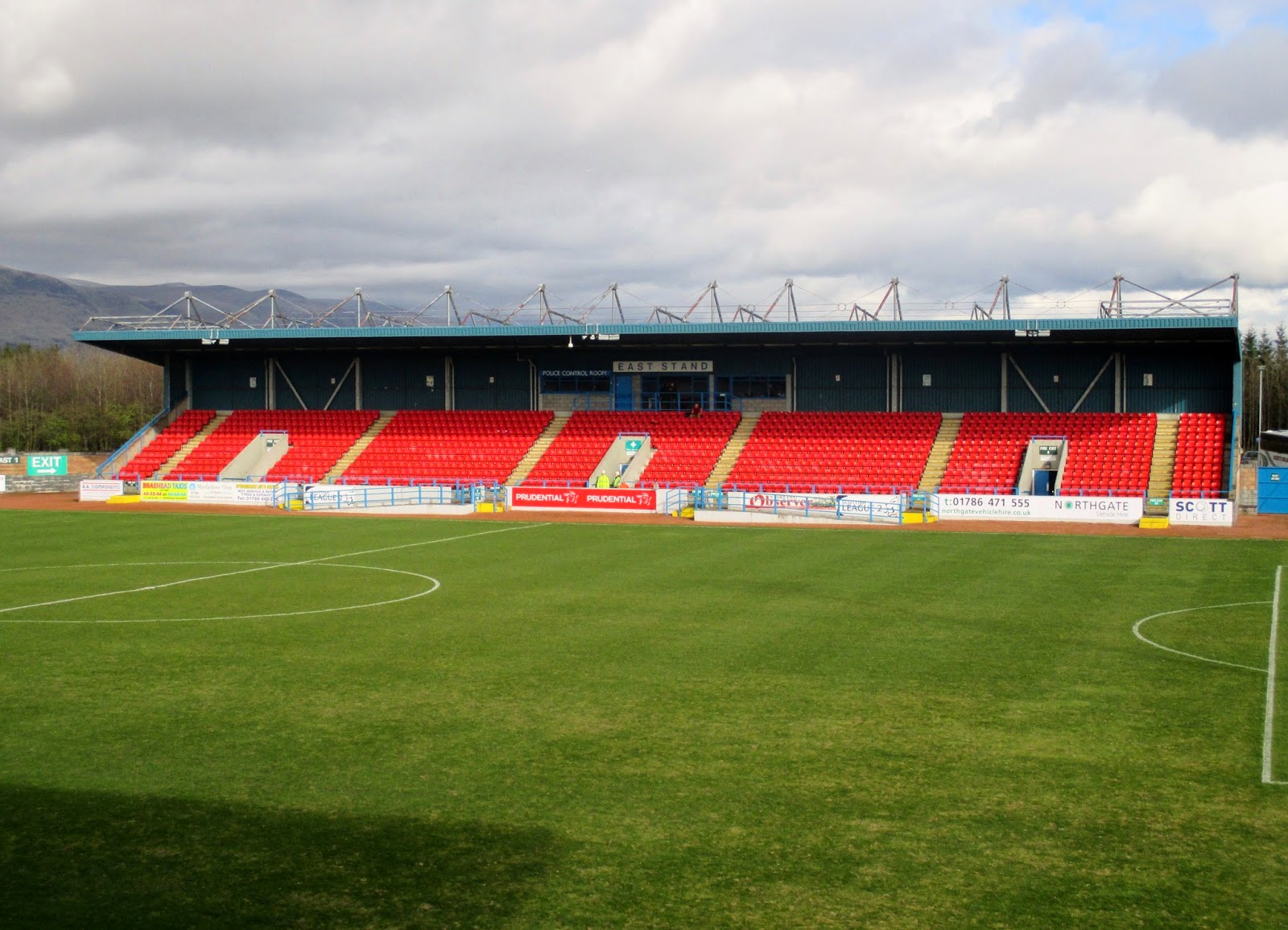 The 3,808 capacity stadium has two seated stands at the sides and open terraces behind the goals. The main stand is on the west side having a single tier block of red seats with SAFC picked out in white with the club offices, hospitality suites at the back and team dugouts in front. The East Stand is of similar style but smaller in length which brings the overall seating capacity to 2,508. The east side also has a Police Control Room, TV gantry and press box. The terraces are identical with room for 300 at each end with the North Terrace allocated to away supporters, although neither are used unless there's a big game with a decent crowd expected. The ground is completed with four very tall and skinny floodlights, but the best feature is the picturesque backdrop to the north, which includes the Wallace Monument at the summit of Abbey Craig.