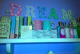 This shelf you will find in my dressing room. Its actually more a shelf for show than serving a purpose. My dressing room has a shabby chic style and is full with lots of pastels. When we first moved into our home, I remember really wanting to get my dressing room set up. It was our first home together and I'd never had a dressing room before, so couldn't contain my excitement! The 'Dream' sign I rushed putting up, I didn't know what I was doing, but just grabbed a hammer and a few nails and went for it. Predictably I did a bit of a 'bodge' job, it's definitely not as straight as I'd have liked! Luckily not many people come in this room to see my DIY skills though! The 2 lanterns either side were really inexpensive and I thought it added some sort of symmetry to the shelf, as well as doubling up as book stands too! As you can see I'm a fan of chick lits, Sophie Kinsella being one of my favorite authors. But only pastel coloured books are allowed! The small card in front of my books is a thank you card given me to whilst I was in Vegas by my brother and sister-in-law, thanking me for being their bridesmaid. It has a cute fairy style design on the front so I thought the whimsical-ness of it matched the theme of my room. Whimsical-ness - is that even a word? Oh well... The box underneath the mugs is actually an old beauty box that I am subscribed to. I loved the design and colours of it and thought it was too pretty to hide away so added a little definition to my shelf. It's actually faded a lot from the sun now so I may have to do a little moving around soon! The mugs on top are bargains that I picked up from a supermarket. Again, the pastel colours attracted me. They don't get used, they're just for show. I'm in the process of replacing these with some vintage tea cups instead as I think they might be a little more appropriate! The bubble baths in the front row I thought were perfect for this shelf - pastel coloured with a cute vintage cupcake style design on the packaging. I picked these up in the Christmas sale really cheap! They smell divine too! Behind them are 3 body moisturisers that I picked up all the way from Las Vegas from their famous Bath & Body Works shop. I have 2 the same because they smell SO good and I was frightened of running out of one and never being able to replace it, so I bought 2 identical ones! I'm still really strict on when I use them, special occasions only! Not only do they smell good but they remind me of my time in Vegas. I love getting flashbacks of holidays through scents - is that strange?! Next to that is some body mist. This too is from Bath & Body Works and is the same scent as the moisturisers but in a different form! The consistency of this is strange, its like a lava lamp inside! Its full of shimmer and looks pretty to look at so it made the cut! Victoria Plumb currently have an interior design interactive quiz on their website which determines who you take after for your home interior style in the celebrity world! I took the quiz (which was actually good fun!) and I turned out to be Mrs Boho Chic who resembles the likes of Monica and Chandler from Friends! Go and take the quiz and let me know who you resemble! You can be entered to win a competition too on completion! Its handy for those that aren't too sure on their home style as well! Go and take a snap of your 'shelfie' to be in with a chance of winning, but hurry, the competition closes tonight at midnight! Good luck!