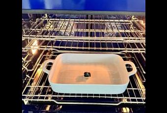 Once the oven reaches 200 degrees, place the dish on the middle rack. Close the door and let the steam from the water and dishwashing pod work its magic for about an hour. - Cool Down & Wipe Clean: