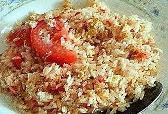 After frying the spices until fragrant, push them to side of pan, heat little oil and crack the eggs. When cooked add in rice, salt and tomato. It is now ready to be served.