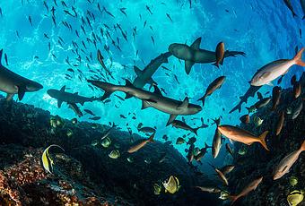 Seen from above the ocean surface, the tiny island of Roca Partida appears as two small peaks jutting out from the water. Underwater, however, this remote island of the Revillagigedo Archipelago hosts a rich marine habitat. Here, whitetip reef sharks, Pacific creolefish, barberfish, and Moorish idols populate the reef.