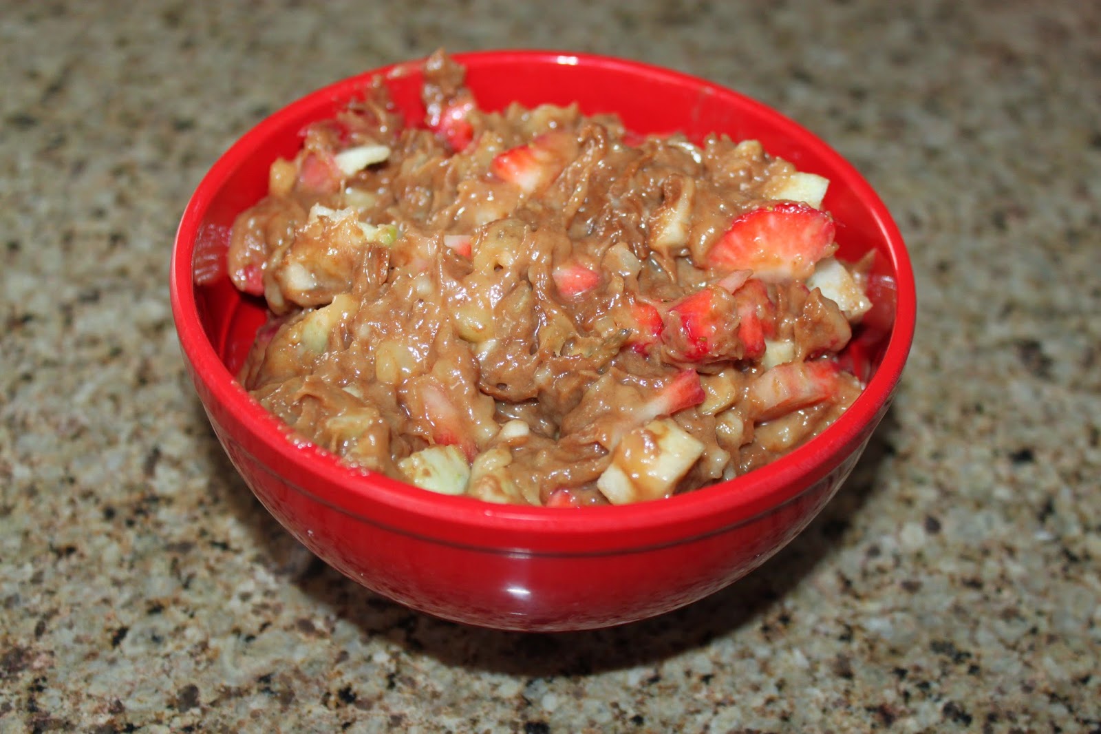 Ingredients:1/4 cup peanut butter2 medium bananas, mashed1 cup sliced strawberries1 medium apple, slicedDirections: Mix it all together in a bowl