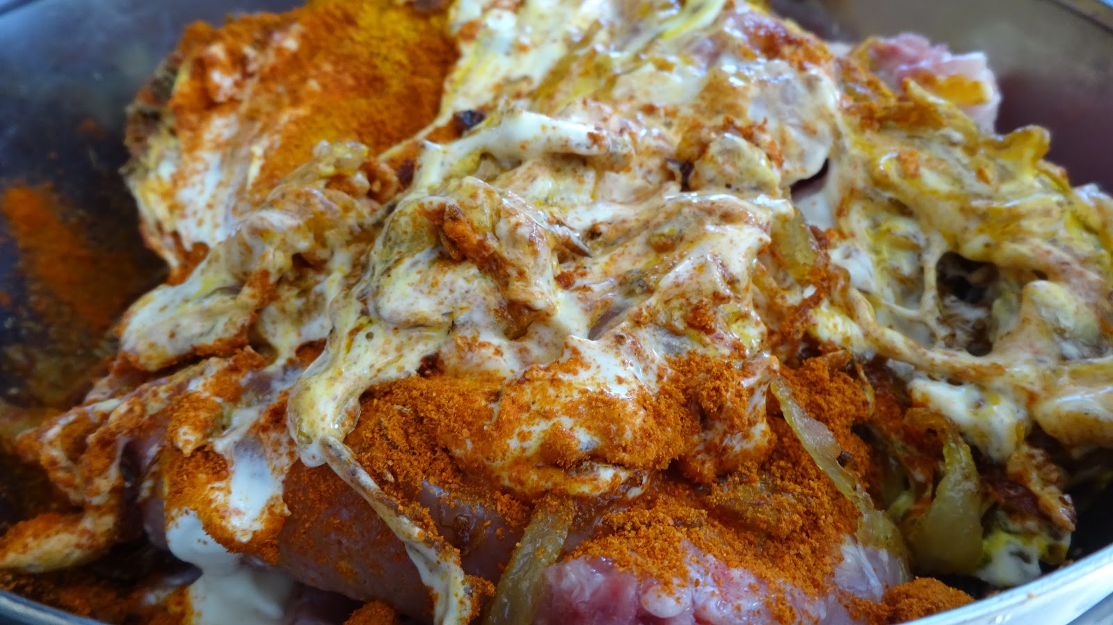 Marinate the chicken along with red chilli powder, garam masala, yogurt, turmeric salt and fried onions.