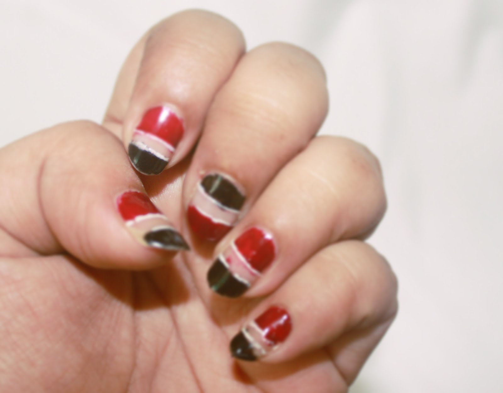 I painted Oriflame The ONE Long Wear Nail Polish - London Redand Golden Rose Rich Color Nail Lacquer One Step Maxi Brush #105on half-half portions of my nail leaving a gap in between. Also have outlined the cut outs using white nail art pen. To the middle finger, I have just inverted the place of maroon and black color.