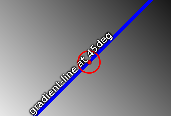 An image showing a box with a background shading gradually from white in the bottom-left corner to black in the top-right corner. There is a line, illustrating the gradient-line, angled at 45 degrees and passing through the center of the box. The starting-point and ending-point of the gradient-line are indicated by the intersection of the gradient-line with two additional lines that pass through the bottom-left and top-right corners of the box.