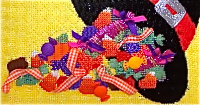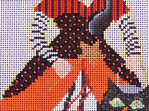 Finally, here's an update on my Stitching Games progress: the canvas I chose was this, Ethel the Little Witch by Patty Paints. The clue for January was "shape up" so I went for the very obvious interpretation and stitched her corset. I used Neon Rays Plus and Sundance Beads in Criss Cross Hungarian.