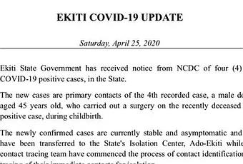 The Ekiti State Government has confirmed 4 new cases of Coronavirus, bringing the total number of active cases in the state to five.