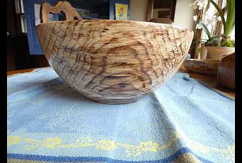 The weed pots are from apple wood (thanks, Suzie and Nancy!) There is colored resin in the natural cracks.  The wood is beautifully spalted--the result of decay/fungus.