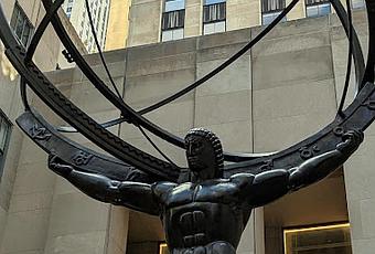 Atlas is a bronze statue in Rockefeller Centre, within the International Building's courtyard, in Midtown Manhattan in New York City. It is across Fifth Avenue from St. Patrick's Cathedral. The sculpture depicts the ancient Greek Titan Atlas holding the heavens on his shoulders. Atlas was created by the sculptor Lee Lawrie with the help of Rene Paul Chambellanand was installed in 1937.The sculpture is in the Art Deco style of Rockefeller Center. The figure of Atlas in the sculpture is 15 feet (4.6 m) tall, while the entire statue is 45 feet (14 m) tall. It weighs 7 short tons (6,400 kg), and is the largest sculpture at Rockefeller Center.