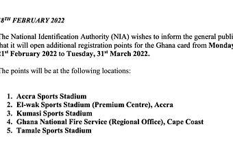 The National Identification Authority (NIA) will add additional registration points for the Ghana card from Monday, February 21, 2022, to March 31, 2022.