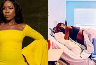 Sharing an image of the second she was in labour, Akindoju revealed that she needed to keep in a kneeling place to assist her baby's supply.