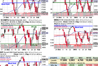 Wages did finally go up in December – up 12 cents to $24.75 (0.5%) and up 2.2% for the year – almost keeping up with inflation! That's too much for the Fed and our Corporate Masters, though and that means we're going to have nice shorts on our Index Futures at Dow (/YM) 17,850, S&P (/ES) 2,062.50, Nasdaq (/NQ) 4,262.50 and Russell (/NQ 1,207.50.
