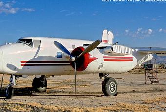 From my first and only visit to the Milestones of Flight Museum. This tired B-25 Mitchell was delivered in 1942 and spent its short military life Stateside before being surplussed in 1945. Among a variety of ownership changes, she spent thee years in the Dominican Republic Air Force before being sold in January 1953 to the Hughes Tool Company. In 1953, she was converted into an executive transport, modifications included a toilet, sink, bed, storage in the bomb bay, extra fuel tank, and rear doors. After the modification, she was operated for a couple of years with the Hughes Company but was not flown after l955. In July 1974, she was transferred to Antelope Valley Aero Museum (now Milestones of Flight Air Museum) in Lancaster. After closure of the Museum in 2015, the Mitchell was sold to a new owner with hopes of restoring to airworthiness reflecting the VIP configuration. Panasonic FX30 photo.