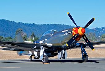 P-51D Mustang “Speedball Alice” seen at rest during the 2016 Wings Over Wine Country airshow. This P-51 wears the livery used by Capt. Don Bochkay of the 357th Fighter Group. During World War II, Bochkay was credited with 13 aerial victories , including two Messerschmitt Me 262 jets. More than 8100 of the P-51D were produced, contributing to the total of 15,000 Mustangs built for the war. Approximately 300 survive today with 172 in airworthy condition. After World War II, the P-51 Mustang served in the air forces of over 55 countries.