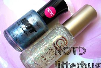 I used Collection's nail polish in Jitterbug (53), a greyish blue color with a sliver sheen to it which I love because of the unique color. It reminds me of something very futuristic! It's a fast dry polish and it sure drys fast. Also it didn't chip for over a week! I really love Collection polishes. They have a great flat brush which makes it easy to apply, the consistency is great and they dry fast. And because I love glitter, I had to add a glitter polish on top which you can't even see sadly : / I added the Constance Caroll glitter polish on top in 31 fairy dust which is an iridescent glitter polish. I haven't heard of this brand before but this is great nail polish. It was only a £1 from a random shop. It looked really pretty in real life though.