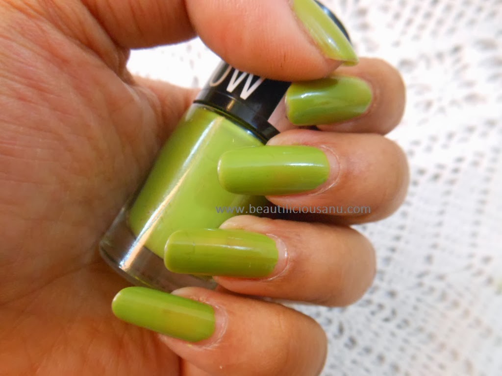 Mint Mojito is a lovely matte fresh green. I'm too fond of such colors. The shade is very brightening and goes opaque with a single coat. The finish is glossy and rich. Without Top Coat the chipping started after 4-5 days and with Top Coat, I could see the color wears off after a week from the edges. Thumbs up for the amazing staying power. The glossiness was intact till the 7th day.