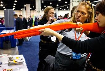 Ruthann Sprague, with the National Rifle Association, shows Bonnie Kristian, 24, of Alexandria, Va., foreground, how to hold the Laser Shot at a shooting simulator booth run by the NRA at the 40th annual Conservative Political Action Conference in National Harbor, Md. on Friday, March 15, 2013. (Jacquelyn Martin/AP)