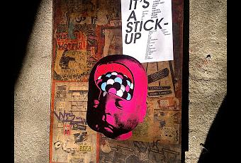 Extract from It's a Stick- Up:'Many street artists don't graffiti or stencil anymore but use pre-prepared paper images that can be pasted up quickly and easily and then taken down, therefore avoiding a vandalism charge.'
