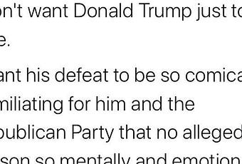 Image may contain: text that says 'Middle Age Riot @middleageriot Idon't want Donald Trump just to lose. want his defeat to be so comically humiliating for him and the Republican Party that no alleged person so mentally and emotionally unfit to be president is ever elected or even nominated again.'