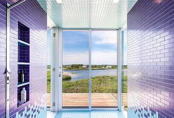 Consider this lively bathroom that sits within a recently completed waterfront home in Southampton, New York. Situated on two-and-a-half acres of land with 360-degree views of the nearby bay and ocean, it's covered with brightly colored floor-to-ceiling tiles that reflect the shades of the neighboring water. One step through the sliding glass doors and you’ll find yourself on an open terrace.
