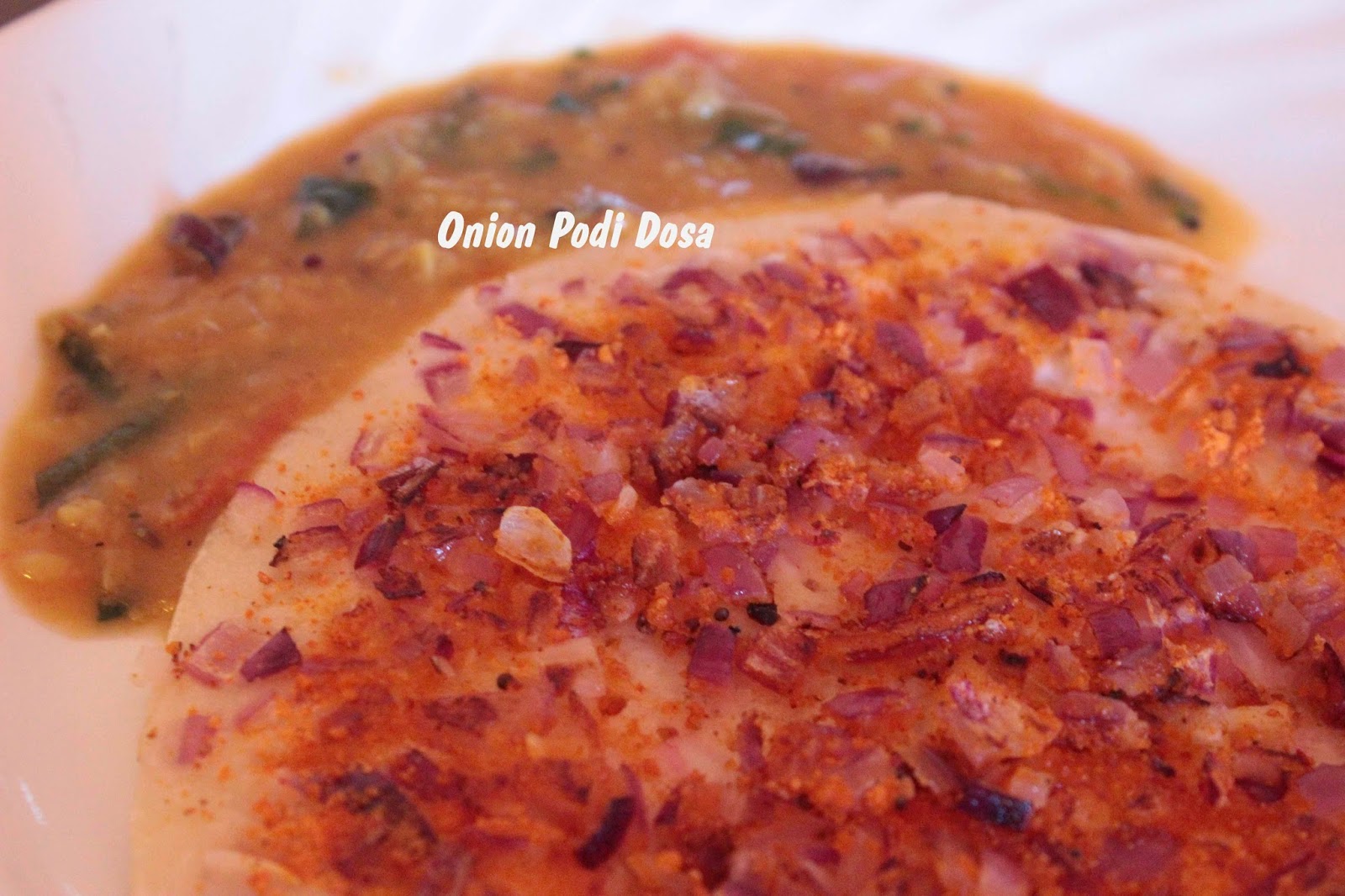 This time I made onion dosa(uthappam) with the idli podi (spiced chutney powder). The taste was so good and a treat for spicy dosa lovers. This recipe is so easy that you will just need to chop the onions (no need of sauteing the onions) and sprinkle the idli podi (spiced chutney powder). If you have sudden arrival of guests, you can surprise them with this onion podi dosa. Infact you should have the idli or dosa batter.