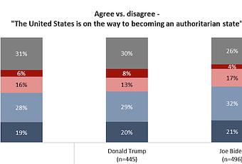 These charts are from the Angus Reid Forum USA Poll -- done between January 9th and 12th of a nationwide sample of 1,178 adults, with a 3 point margin of error. They show that most Americans will doubt the accuracy of the election results in November. The chart below, from the same poll, shows that most also believe the nation is headed toward authoritarianism.
