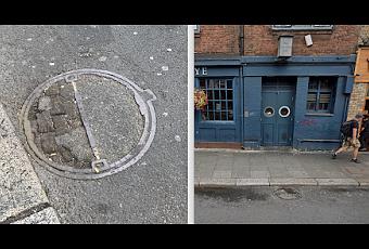 Rushing from a bus stop opposite Sainsbury's to Camden Town tube station yesterday, I glanced down at the curb outside the pub on the corner (these days called The Camden Eye, previously The Halfway House and many more names pre-that) and I noticed a man hole cover plate half filled with wood blocks.