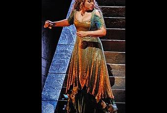 Mention Nabucco to even the most casual opera fan and their thoughts immediately fly to this famous chorus, sung by the captured Hebrews on the banks of the Euphrates river. In this case, the singers were arranged on a pile of rocks that looked like a ruined Sumerian temple. The chorus was beautifully delivered by the Met's small army of singers, singing with rich power and emotion. Conductor Paolo Carignani took a leisurely tempo, allowing the impact of the words to sink in.
